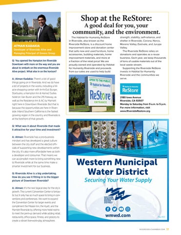 A good deal for you, your community, and the environment. ATMAN KADAKIA Developer of Riverside Alive and Managing Principal of Greens Group Q: You opened the Hampton Inn Riverside Downtown with more on the way and you are about to embark on the enormous Riverside Alive project. What else in on the horizon? A: Atman Kadakia: There’s a lot of good things going on in Riverside. And we do have a lot of projects in the works, including a 14acre shopping center with In-N-Out Burger, Starbucks, a Hampton Inn & Home2 Suites hotel on Van Buren and the 215 freeway, as well as the Residence Inn & AC by Marriott right here in Downtown Riverside. But that is because the opportunities are here in Riverside. Inland Southern California is the fastest growing region in the country and Riverside is at the forefront of that growth.