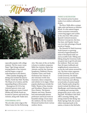 especially popular with college students. The live music venue Paper Tiger brings national touring bands to San Antonio and has begun a surge of redevelopment in the district. Other popular shopping and dining areas include the Quarry Market, North Star Mall, The Rim, The Shops at La Cantera, and the expanding Shops at Rivercenter. Homegrown H-E-B is San Antonio’s grocery store, and high-end grocery stores Central Market and Whole Foods are located in Uptown and north San Antonio, along with Trader Joe’s.