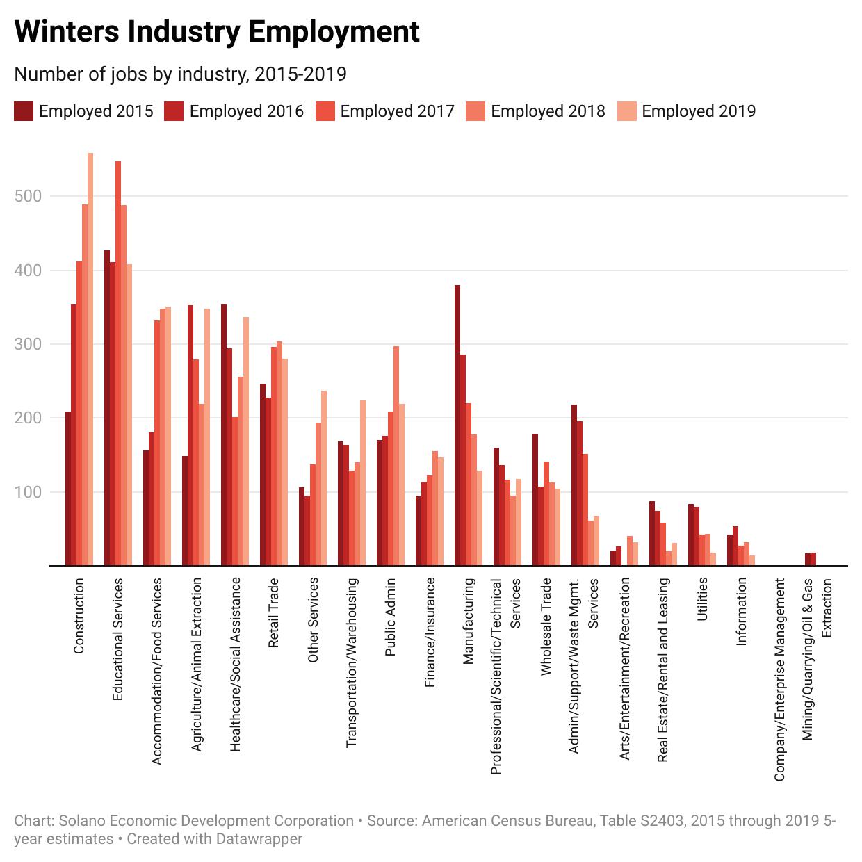 The largest employers in Winters represent the agriculture, government and hospitality sectors. Similarly, the largest employment sectors for Winters’ residents are agriculture, construction, education, healthcare, and lodging/restaurants (accommodations/food service). Agriculture, construction and lodging/restaurants are the fastest growing of its industries.