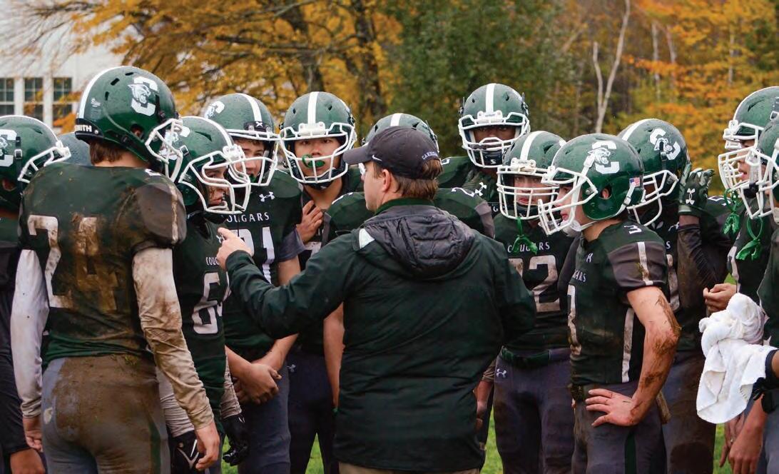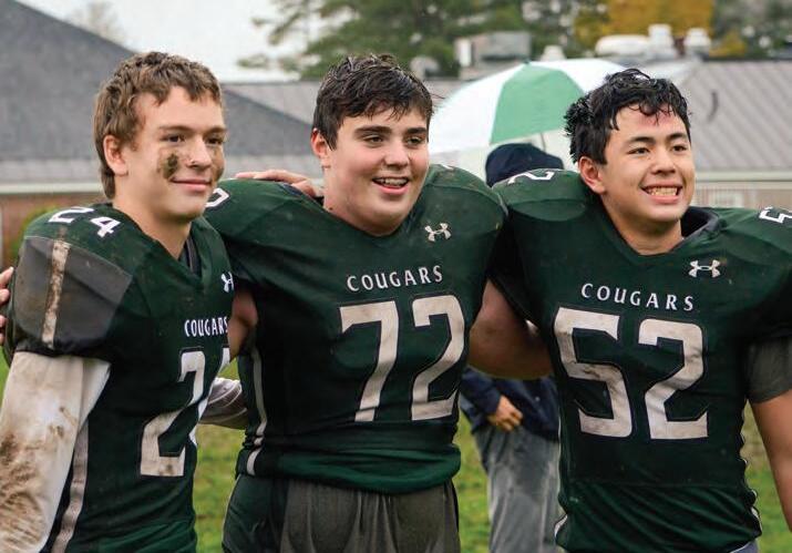 When the final buzzer sounded, a collective cry echoed through the rain. The Cougars had won the game, not for themselves but for Cardigan, for everyone who had stood on the sidelines and cheered, for all Cougars—past, present, and future. The team broke from the sidelines and ran across the field to their brothers who had stayed to cheer them on, and in a soggy dripping huddle, they broke out in song: “To Cardigan our favored school / By nature’s gifts benign— / We raise in song our thankfulness / For beauty which is thine…”