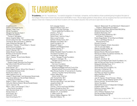 TE LAUDAMUS Te Laudamus, Latin for “we praise you,” is a special recognition of individuals, companies, and foundations whose sustained giving throughout the years to the College of Mount Saint Vincent has amounted to $100,000 or more.* We are deeply grateful to these donors, and we recognize that their commitment has played a critical role in helping to provide Mount students with the excellent education that continues to open doors to their future.