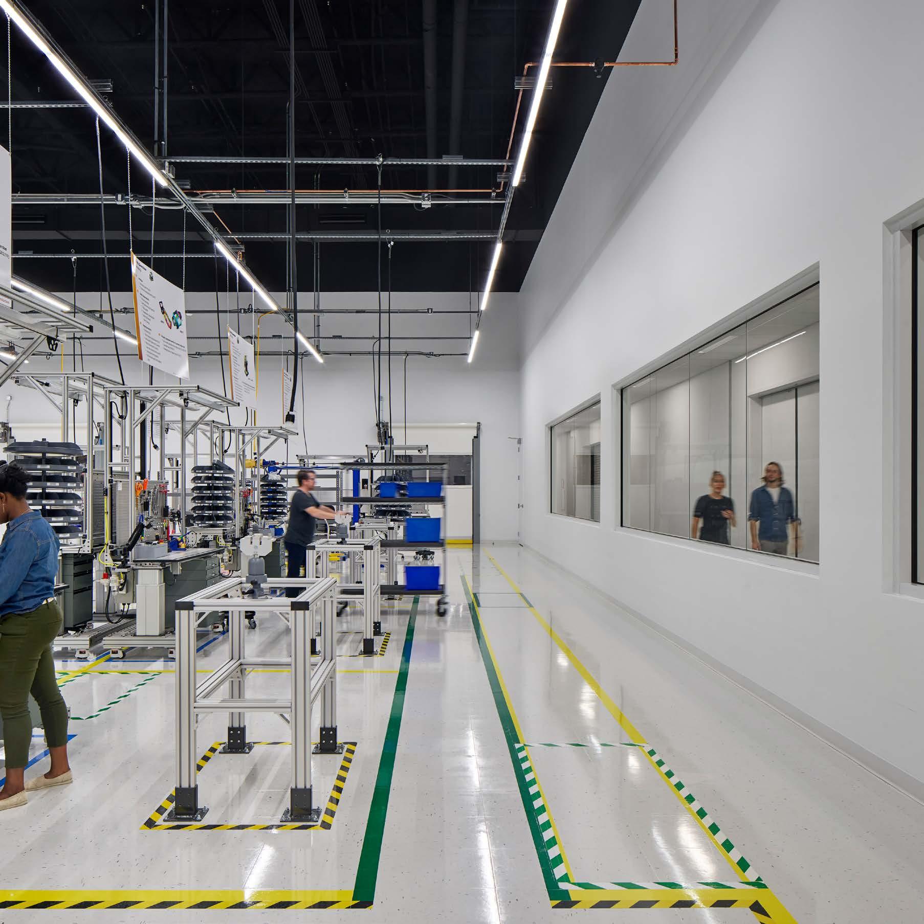 lab space, and conference rooms. The industrial warehouse component houses a receiving inspection office, forklift charging, and foam packaging.