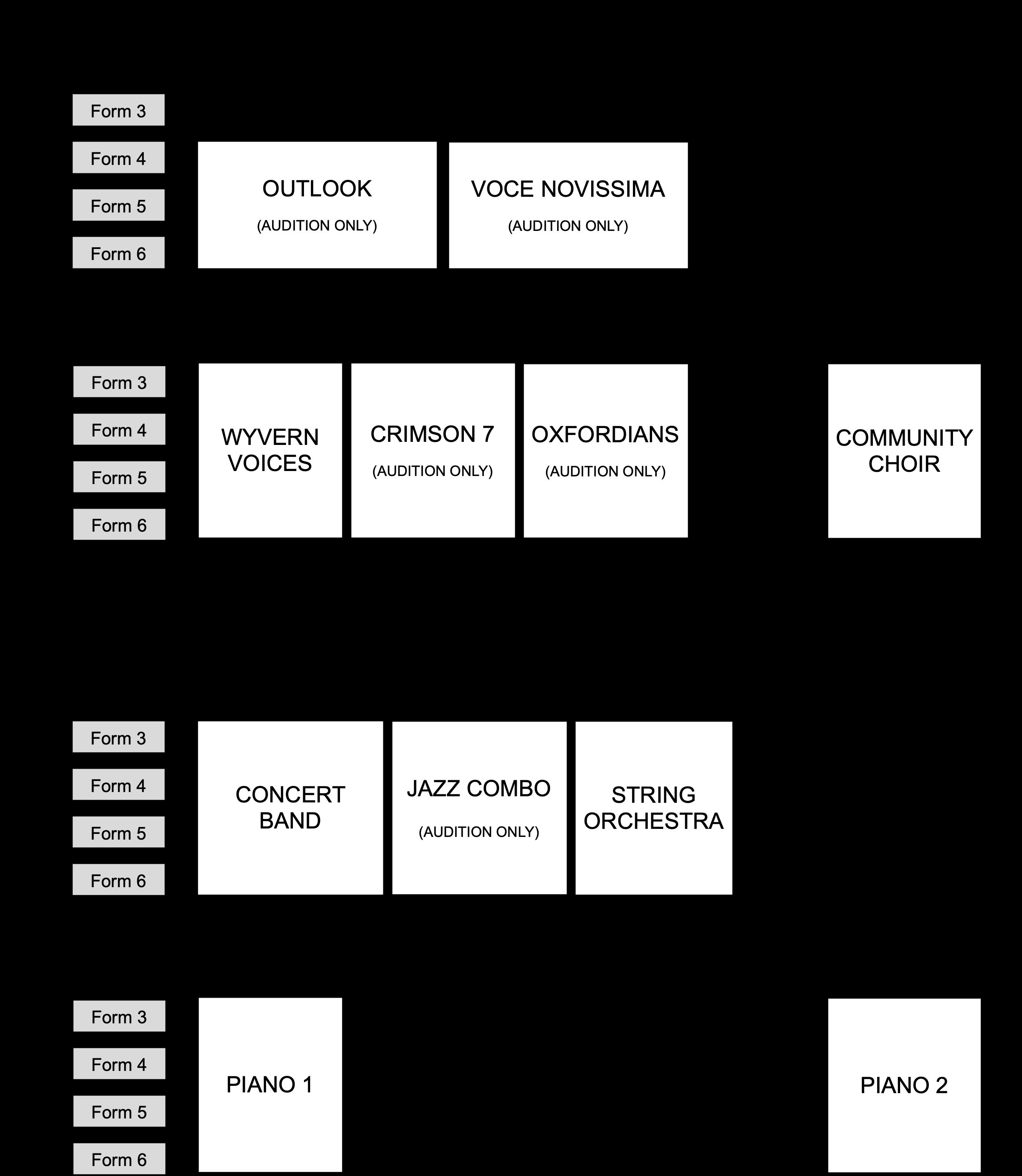 *Students enrolled in A Cappella are also required to rehearse on select Tuesday night rehearsals (7:00PM-8:30PM) in preparation for our annual a cappella competition, The Wyvern Invitational A Cappella Festival. A cappella singers are required to participate in at least one of the following additional ensembles: Wyvern Voices, Outlook, Voce, Orchestra, Band, Jazz Combo.