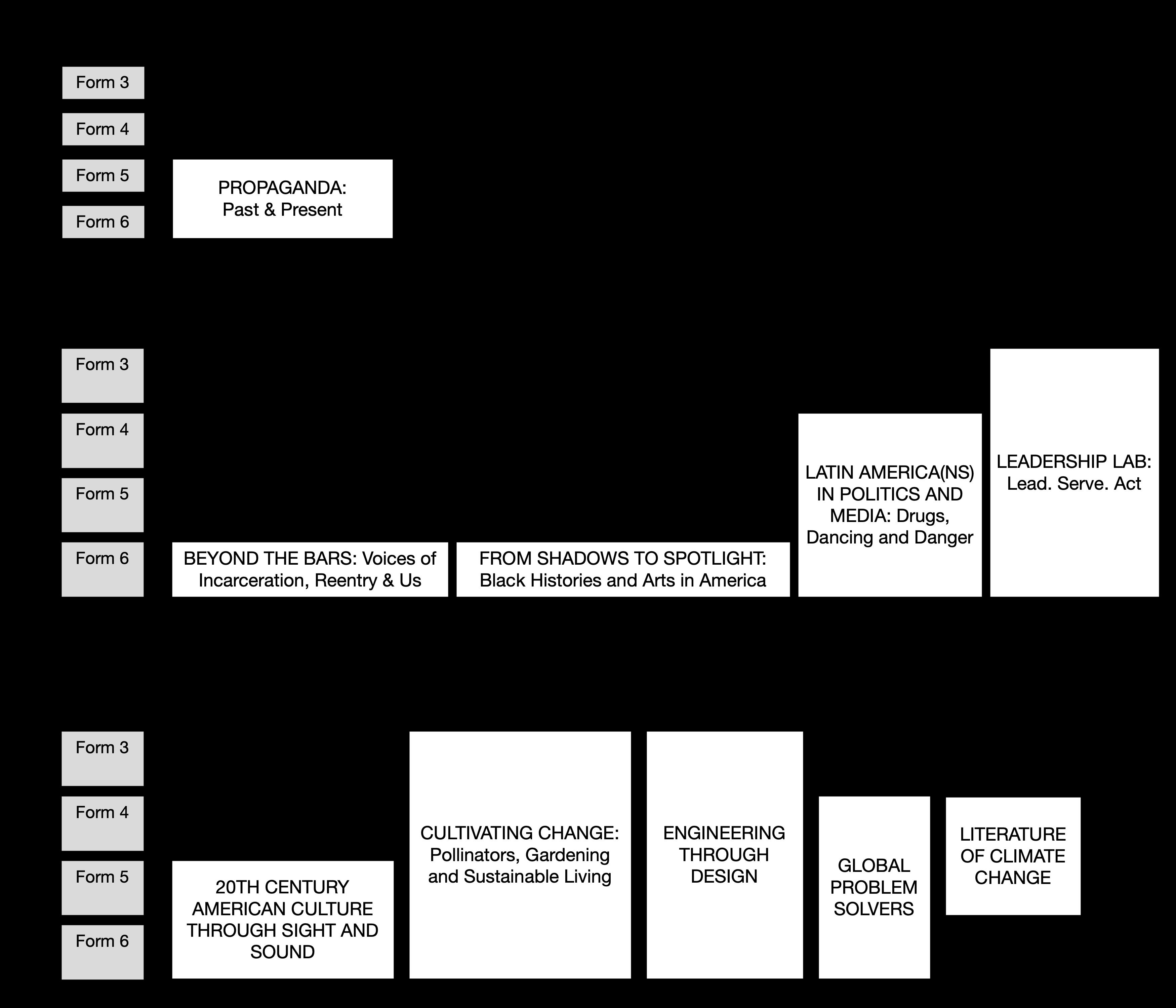 Throughout the semester, students will document their growth in an ongoing portfolio, refining their research, communication, and reflective skills. This portfolio will serve as both a record of their leadership journey and a foundation for their final assessment. At the end of the course, students will present their work to a chosen community audience in a format that best conveys their impact. This culminating project may take the form of a design proposal, community action plan, leadership portfolio, or digital storytelling piece, allowing students to showcase their learning in an authentic and meaningful way. Open to students in Forms 3-6.