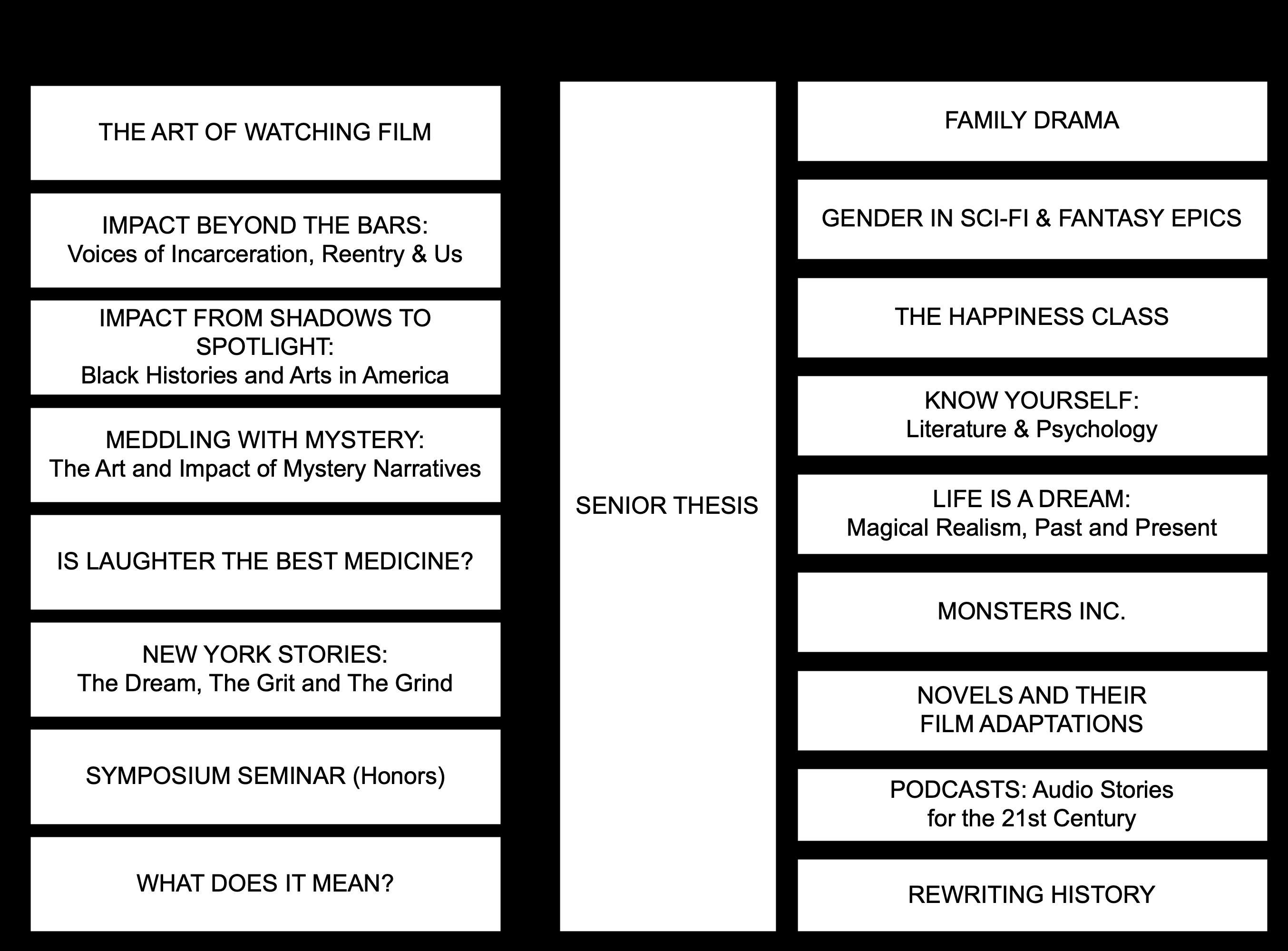 Senior English at Kingswood Oxford offers semester elective options. During the fall semester, students must choose one class to fulfill their English requirement but may elect to take an additional semester course according to their interest and availability. The spring semester electives are divided into two quarters. During the third quarter, all seniors write a senior thesis, a fifteen to twenty-page original, research-based essay on a topic of their choosing. The fourth quarter, described by the course’s title, is a mini-course designed as an exploration of a topic that is both focused and fun.