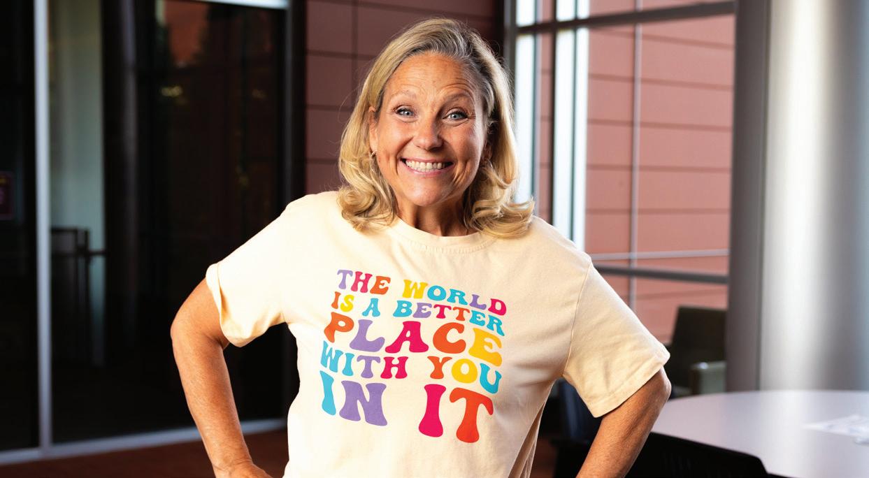 During the pandemic, Holly Hoffman, professor of Human Development and Family Studies, started wearing T-shirts with positive messages every Tuesday. Five years later, she’s still going strong — and she started a movement.