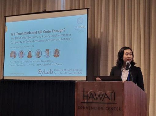 Chen and Shu were lead authors on “Is a Trustmark and QR Code Enough? The Effect of IoT Security and Privacy Label Information Complexity on Consumer Comprehension and Behavior,” which Chen, a CMU School of Computer Science student, presented at the 2024 Association for Computing Machinery (ACM) Conference on Human Factors in Computing Systems (CHI 2024).