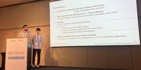 The paper, “Perspective: A Principled Framework for Pliable and Secure Speculation in Operating Systems,” features CMU Computer Science (CS) undergrads Tae Hoon Kim and David Rudo as lead authors. Kim and Rudo presented this work in Buenos Aires, Argentina in June.