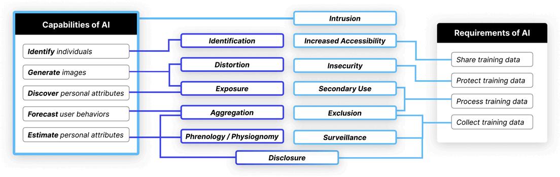The researchers identified 12 privacy risks that the unique capabilities and/or requirements of AI can entail. For example, the capabilities of AI create new risks (purple) of identification, distortion, physiognomy, and unwanted disclosure; the data requirements of AI can exacerbate risks (light blue) of surveillance, exclusion, secondary use, and data breaches owing to insecurity.