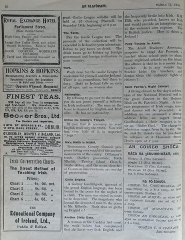 broke into Irish. R.ir. she frequently great Gaelic League ceilidhe will, be Hill· who presided, knows no Irish ROYAL EXCHANGE HOTEL held at 25 Cearnog Pharnell, on and' would an interpreter provide onl;· at 8 p.m. 18th, beginning s aturday Parliament Street. at the ,voman's own expense. Th� (Near Dublin Castle). is British justice. How it shine, in The Taxes. High-Class Family and Commercial Pay the Gaelic League tax. The Ireland ! Hotel. roceeds of the collection, will be p Large New Coffee Room now added. Tyrants In Acalll. Petty expended in Ireland to your advantage. Superb Bedrooms. Electric Light The Acaill 'I'eachers' Association throughout, Refuse to pay taxes on drink. �he GOOD COOKING. �IODER_&\.'l'E to C:\.'])Cl An Paorach, a drink taxes to bolster foreign up proposes go CHARGES. government and foreign civilisation in teacher whose school puts to shams Tariff and Illustrated Souvenir on application, many anglicised schoo�s 011 the isla�d. your country. His offence is that he is a manly l·rzsh teacher. Is it any wonder that Work. Work done for the Gaelic League is Starkie kicks the teachers, and denies them the ordinary rights of Manufacturing Jewellers & Silversmiths. \vork .done for yourself and for Ireland. • • Sp�cialitit-Celtic Jlrt J�wellerg There is no compulsion, but there is citizens ? -- in Gold an'1 Siluer. -to Ireland falls on men duty. Duty cai;;�!uo Opposite O'Cennell Monument of all ages, and on women also. Saint Patrick's Night concert. Telegrams, Meyther, Dubliu:-'Phooe, 3569, DUBLIN .t\ fittinz climax to the day's celebraNationality. tion of the National Festival will be By refusing to go over to the enemy the great Concert in the Rotunda you do not prove yourself a believer Rink on St. Patrick's Night. A first· W:& buy all our Teas by aom,-riNa • and fir1trh&Dd. We, therefore, ou in Irish nationality. The man on the rate programme of Irish songs> music offer the pick of the Ma1·ket at 3/·, 2/1 O, fence is and Irish by English despised and dances will be presented.' , In '1./8, 2/6, 2/4, 2/'1. per lb. alike. He has 110 nationality.. addition we are promised a stirring • address from an sagart breagh Utilise the Enemy's Tongue. Tea Dea11n and 1m,ortera. Gacdhcalaoh ,1 chuir ruagairt is fan IC you find iu to . r cad necessary air an '' Ridire Gael.'' The charge for , ITH. aT. aEoRae·a sr., English read 011ly the truth, YOU will admission 17 NTH. EARL ITIIEET, ranges from 3s. to 6d. The find v..c1·y little of it in imported 3s. and :2s. tickets can be purcl1ascd O'LOOGHLIN, MURPHY tl BOLAND, Ltd • '' rags." in advance at 6 Harcourt Street. ltl, 111 UPl'•II Delll•T ITll••T. DU.LIN Lltll .. ra11111, a L1tt1rpr111 Prlnten_ Doo1· s at 7 t'� . ope11 }).m. Wll•I•••• ltatt•n•r•. •••klllnd1r1. Pa11r ... Ma's Maith is Mlthld. ••11•fa1t11r1r1. P•••r a Twine M1r1tla111&. S.Nlal faalhl• for '8anu • Cburob Priotln1, Poet•.. A • Roscommon County Council p1·0An coisce INIUllll•I INVIT•D. All lriea ManuJactured Papen atooltN. IJoses taking ov..er control of the ancient htlia Tra4e \luk 04,0. Phoae 041. 'B. Tel1rarn.1-., Paradise, DobUu." ·o!t:J.\ na 3CRU1nn1U3At>, 1916, monuments of the county. O'Connor's tomb, Daithi 's gravestone, Rath m.an_c.6. 11 (>01.6. S.6.t.6.1n.n ). Mheibh, Trinity Island Church, Co11 6.bt\.&n 11 {'01.6. ma me ). Boyle, Abbey, and the seven churches be.6.tc.61ne 13 {t)1.6. SAt.6.1n_n ). The Direct Method of of Cia1·a11 011 Inis Clothrain, are worthy me1t:e.6.til 13 (>01.6. ma tn.c). of preservation. Teaching Irish. 1t1t 8 (>o16. S.At.6.1'fl.tl). •