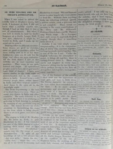When I was asked to attend the ccilidhe held at Stephen's Green, last week, I hesitated at first, I did not know what a ceilidhc exactly was, though I had a11 idea that it was a sort • of entertainment. But when I was told it would be held by Gaelic Leaguers at a Gaelic League IIall, I was sure, whatever it might be, it would be Irish, and I" made llp my mind not to miss it. Dancing differs in different countries. Some dances are good as exercises, some are good as pastimes, either for those taking part i11 it or for those looking on; some are fit only for the stage, and others are 111c1·c curiosities. All the Irish dances I saw at this ceilidhe are at 011cc exercises and They seem to 11.1e quite pastimes. natural and simple. All agricultural peoples seem to havc developed near ly same kind of dances. I have seen dances similar to the Irish eight 01· sixteen-handed reel i11 the country places in India. Ireland being a cold country people dance within doors ; in India and other tropical countries they dance in the open air i11 the moonlight night. The Irish step-dancing is the best of its kind I have ever seen. There arc many step dances in India and other countries. The main difference is, to my mind, that there is no posturing 01· gesturing in Irish dancing to indicate the meaning of any particular song 01· story. The dancer devotes his whole attention to harmonising his steps to the tune which is being played. There is art in it, grace, and above all, agility. The singing in Irish of Mr. Bradley, like his name in .Irish, is pu1·c Hindustani to inc. I was reminded for once of the fakirs singing 01· rather reciting, their sacred· verse at their holy fcstivals : '' '' Ovrullakhan '' sounds very like the name of some Mahommcdan. In spite of my knowledge of not a fcw phrases like '' djcs mur geth, '' '' kanus tha thu," '' cailin dcas," '' thigin thu," etc., it was all to me Greek in meaning, and