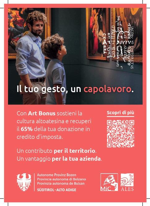 Al Centro Trevi-Trevilab di Bolzano si è tenuto un incontro di presentazione di questo nuovo strumento, utile per conoscere le potenzialità ed il funzionamento e scoprire le peculiarità ed i risultati raggiunti da alcune istituzioni culturali locali Il vicepresidente e assessore alla cultura italiana Marco Galateo ha sottolineato come l’adesione all’Art Bonus rappresenti per le imprese un modo per contribuire attivamente alla tutela e alla valorizzazione della cultura della nostra Provincia, lasciando un segno tangibile e promuovendo un senso di responsabilità sociale. Carolina Botti, referente di Art Bonus per il Ministero della Cultura, ha illustrato il funzionamento e le potenzialità dello strumento