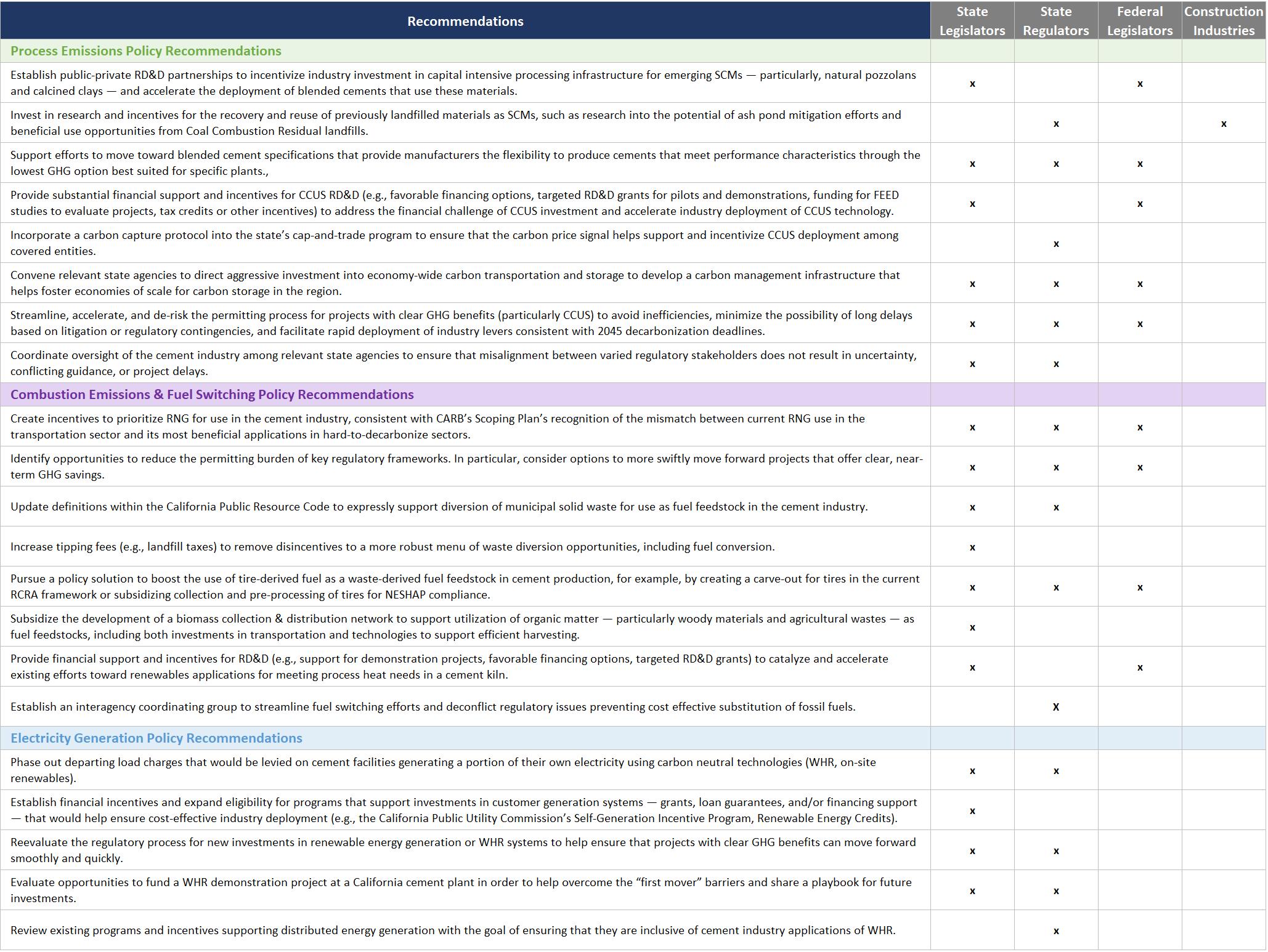 This report recognizes the fact that there are no shortcuts or silver bullets to achieving deep decarbonization within the California cement industry. Rather, there is only the hard work associated with longterm planning, purposeful policies, and decades of sustained capital investments from both the public and private sectors. Achieving carbon neutrality in the California cement industry will require a compilation of strategies, including but not limited to: