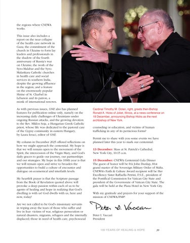 This December, CNEWA’s chair, Archbishop Hicks, will celebrate a centennial Mass at St. Patrick’s Cathedral in New York City on Sunday, 13 December; a reception will follow. Two days later, CNEWA will hold its annual Healing & Hope Gala at the Plaza Hotel. Frà John Dunlap, prince and 81st grand master of the Sovereign Military Order of Malta, will be the guest of honor. Sister Raffaella Petrini, F.S.E., president of the Pontifical Commission for Vatican City State and president of the Governorate of Vatican City State, will receive CNEWA’s Faith & Culture Award.