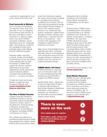 This December, CNEWA’s chair, Archbishop Hicks, will celebrate a centennial Mass at St. Patrick’s Cathedral in New York City on Sunday, 13 December; a reception will follow. Two days later, CNEWA will hold its annual Healing & Hope Gala at the Plaza Hotel. Frà John Dunlap, prince and 81st grand master of the Sovereign Military Order of Malta, will be the guest of honor. Sister Raffaella Petrini, F.S.E., president of the Pontifical Commission for Vatican City State and president of the Governorate of Vatican City State, will receive CNEWA’s Faith & Culture Award.