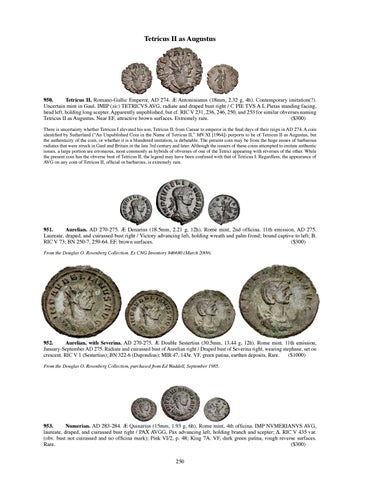 950. Tetricus II. Romano-Gallic Emperor, AD 274. Æ Antoninianus (18mm, 2.32 g, 4h). Contemporary imitation(?). Uncertain mint in Gaul. IMIP (sic) TETRICVS AVG, radiate and draped bust right / C PIE TVS A I, Pietas standing facing, head left, holding long scepter. Apparently unpublished, but cf. RIC V 231, 236, 246, 250, and 253 for similar obverses naming Tetricus II as Augustus. Near EF, attractive brown surfaces. Extremely rare. ($300) There is uncertainty whether Tetricus I elevated his son, Tetricus II, from Caesar to emperor in the final days of their reign in AD 274. A coin identified by Sutherland (“An Unpublished Coin in the Name of Tetricus II,” MN XI [1964]) purports to be of Tetricus II as Augustus, but the authenticity of the coin, or whether it is a blundered imitation, is debatable. The present coin may be from the huge issues of barbarous radiates that were struck in Gaul and Britain in the late 3rd century and later. Although the issuers of these coins attempted to imitate authentic issues, a large portion are erroneous, most commonly as hybrids of obverses of one of the Tetrici appearing with reverses of the other. While the present coin has the obverse bust of Tetricus II, the legend may have been confused with that of Tetricus I. Regardless, the appearance of AVG on any coin of Tetricus II, official or barbarous, is extremely rare.