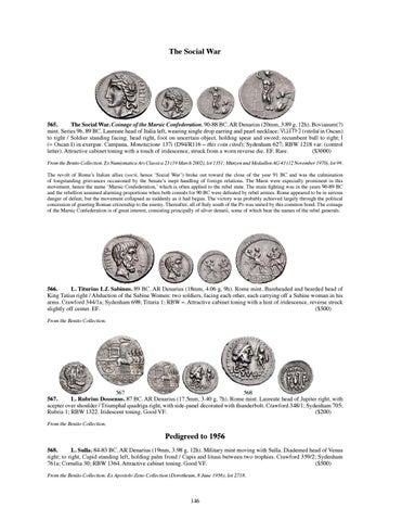 565. The Social War. Coinage of the Marsic Confederation. 90-88 BC. AR Denarius (20mm, 3.89 g, 12h). Bovianum(?) mint. Series 9b, 89 BC. Laureate head of Italia left, wearing single drop earring and pearl necklace; √iLETˆW (viteliú in Oscan) to right / Soldier standing facing, head right, foot on uncertain object, holding spear and sword; recumbent bull to right; 5 (= Oscan I) in exergue. Campana, Monetazione 137i (D94/R116 – this coin cited); Sydenham 627; RBW 1218 var. (control letter). Attractive cabinet toning with a touch of iridescence, struck from a worn reverse die. EF. Rare. ($3000) From the Benito Collection. Ex Numismatica Ars Classica 23 (19 March 2002), lot 1351; Münzen und Medaillen AG 43 (12 November 1970), lot 99. The revolt of Rome’s Italian allies (socii, hence ‘Social War’) broke out toward the close of the year 91 BC and was the culmination of longstanding grievances occasioned by the Senate’s inept handling of foreign relations. The Marsi were especially prominent in this movement, hence the name ‘Marsic Confederation,’ which is often applied to the rebel state. The main fighting was in the years 90-89 BC and the rebellion assumed alarming proportions when both consuls for 90 BC were defeated by rebel armies. Rome appeared to be in serious danger of defeat, but the movement collapsed as suddenly as it had begun. The victory was probably achieved largely through the political concession of granting Roman citizenship to the enemy. Thereafter, all of Italy south of the Po was united by this common bond. The coinage of the Marsic Confederation is of great interest, consisting principally of silver denarii, some of which bear the names of the rebel generals.