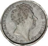 1110. HANOVER. William IV or Victoria. 1830-1837 or 1837-1901. PB/Tin Splasher for a Shilling die (26mm, 1.37 g). London mint. By Jean Baptiste Merlen(?). Struck 1837. BRITANNIARUM REX FID : DEI : , crowned ONE/ SHILLING within wreath of roses, shamrocks, and thistles. Bull 3152 (there attributed to the reign of Victoria, but noting that it could be earlier). Minor marks. Mostly as made. Extremely rare – only one other example known, now in the Royal Mint Collection. No other shilling patterns exist for William IV. ($500)