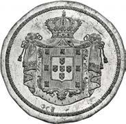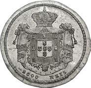 1119. PORTUGAL, Kingdom. Maria II a Educadora (the Educator). 1826/1834-1853. PB/Tin Splasher for a 2500 Réis master die (patrix) (21mm, 1.38 g). London mint. By Jean Baptiste Merlen. Struck 1836. Crowned and mantled coat-of-arms; 2500 REIS below. For pattern, see: KM Pn96; Gomes E16.01. Mostly as made. Extremely rare. ($500)
