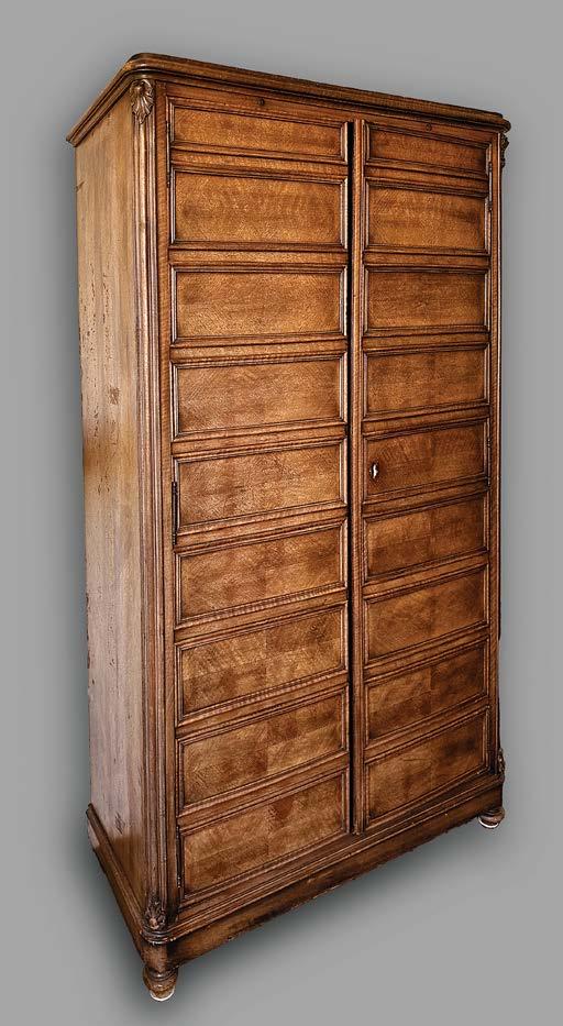 1124. Elegant royal coin cabinet – Reportedly from the collection of King Victor Emmanuel III of Italy. Italy, circa early 20th century. Height 177cm (70”), width 100cm (39”), depth 45cm (18”). Tall coin cabinet of polished light-color wood. The two outer doors that swing open are carved into nine panels per door. The four corners are decorated with carved leaf vignettes. Behind the outer doors, the cabinet has two columns of drawers, each side consisting of 67 for a total of 134 drawers. Each drawer has a thin wooden spacer grid that accommodates 30 coins in 5 x 5cm (2” x 2”) spaces. The drawers are padded on the inside with red felt. The drawers are numbered with original metal round plaques from 1-67 on each side. The bottom two drawers are twice as deep as the other 132 and have no spacers or felt. Above each column of drawers is a letter, E on the left and F on the right, indicating that the original owner for whom the cabinet was made must have commissioned at least two other cabinets preceding this one. One drawer is not original, has a different knob, and has no drawer number (should be no. 18). Three drawers are lacking their knobs. The locking system of the outer doors is intact; the skeleton key is lacking and the original ivory surround for the keyhole has been removed. Otherwise in very good condition.