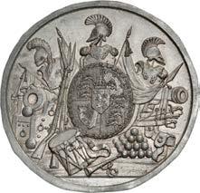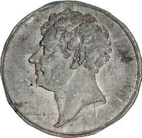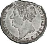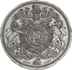 William IV. 1830-1837. PB/Tin Splasher for a Crown die (38mm, 7.89 g). London mint. By Jean Baptiste Merlen. Dated 1837. Coat-of-arms within Garter surmounted by crowned helmet with garland; below, banner reading DIEU ET MON DROIT; ANNO 1837 below; J.B. MERLEN to lower left. For trial strike in Barton’s metal, see: L&S 12 = Bull 2470 = Lingford (Glendining, 24 October 1950), lot 541. No surviving dies match this splasher. Mostly as made. Extremely rare. ($500)