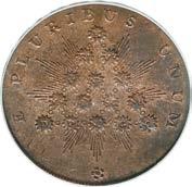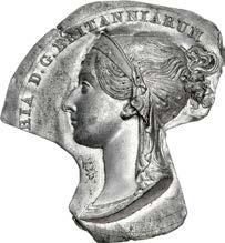 By Jean Baptiste Merlen. Struck 1838 or 1839. BRITANNIARUM REGINA FID : DEF :, crowned coat-of-arms within wreath; spray of thistle, rose, and shamrock. For intended patterns, see: Bull 2788-2790. For intended hub, see Hocking 12634. Some folding at edge. Mostly as made. Extremely rare. ($500)