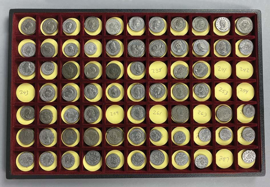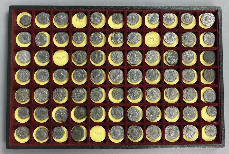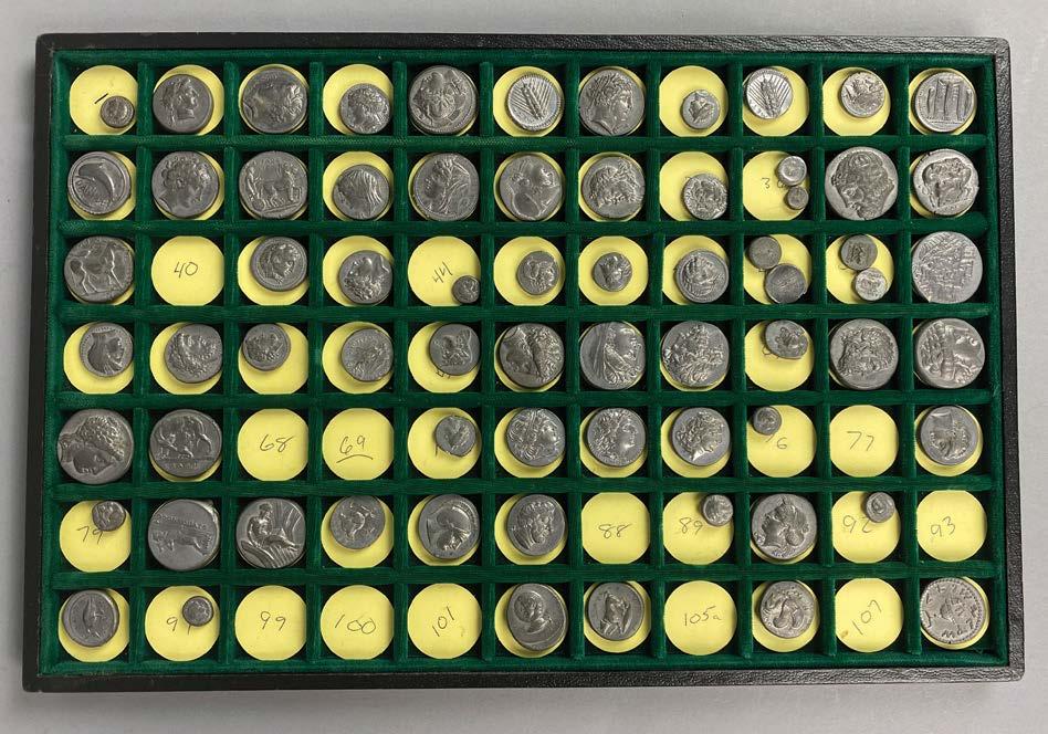 Carl Wilhelm Becker (1772-1830) was one of the most prolific and accomplished counterfeiters of the 19th century. As early as 1806 he was engaged in the practice of manufacturing false coins and other antiquities, apparently as an adjunct to a trade in genuine antiquities. His market was the wealthy princes of Europe, who filled their cabinets of curiosities with Becker’s work. Although Becker was periodically accused of forgery, he defended himself by claiming his productions were “instructive” in nature, and never sold with the intent to deceive. Notes found in his diary after his death suggest this was not quite true. Becker’s death in April 1830 left his family with little money and a quantity of forged coin dies. From these dies, sets of coins were struck in a lead-tin alloy (actually a poor quality pewter) and sold to collectors and institutions. At some point Becker’s family sold the dies to the Saalfeld Museum, from where they finally were given to the Kaiser-Friedrich Museum in Berlin in 1911. The present set was struck at some time in the later 19th century, and represents the majority of Becker’s dies that had survived intact. An important and rare study collection of the work of this famous forger.