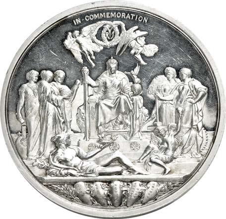 1122. HANOVER. Victoria. 1837-1901. AR Medal (77mm, ~200.00 g, 12h). Golden Jubilee. By J. E. Boehm and F. Leighton. Struck 1887-1889. VICTORIA REGINA ET IMPERATRIX, crowned and veiled bust left / IN · COMMEMORATION, personification of the Empire seated facing on throne, holding reversed sword set on ground and globe surmounted by crowning Victory; above, two cherubim flying and holding shields and wreaths; to left, Science, Letters, and Art standing right; to right, Industry and Agriculture standing left; at their feet, Mercury reclining right and Time seated left; all set on pediment above five interlocked shields inscribed ASIA, AMERICA, EUROPA, AUSTRAL/ASIA, and AFRICA. Eimer 1733b; BHM 3219. Toned, hairlines, scratches, a few light edge marks. Near EF. In original case of issue. ($500)