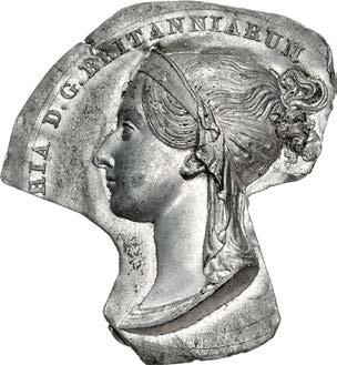 1117. HANOVER. Victoria. 1837-1901. PB/Tin Splasher for a Medal die (36mm, 5.00 g). Coronation. London mint. By Benedetto Pistrucci. [VICTO]RIA D . G . BRITANNIARUM [REGINA F. D.], diademed head left. For intended medal, see: BHM 1801; Eimer 1315. Bent, a few marks. Mostly as made, from just enough medal to fill the portrait. Extremely rare. ($500)