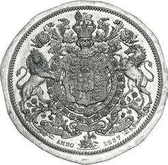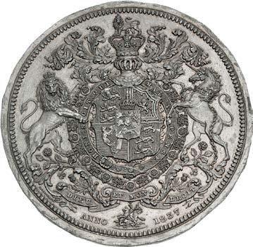 An Order of Council dated 8 June 1838 called for the striking of Five and Two Pound pieces. Initial designs were apparently made by Merlen.