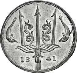 1112. HANOVER. Victoria. 1837-1901. PB/Tin Splasher for a Two Pound die or master die (patrix) (27mm, 1.38 g). London mint. By James Wyon (or Jean Baptiste Merlen?). Dated 1841. Ornate trident; downard facing dolphins flanking; 18 41 below. For uniface trial strike in gold, see: W&R 289 = Hocking 1968. For intended hub and dies, see Hocking 1135-1138. Mostly as made. Extremely rare – only one other example known, a unique trial strike in gold held in the Royal Mint Collection. ($500)
