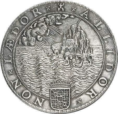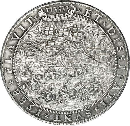 1120. TUDOR. temp. Elizabeth I. 1558-1603. AR Medal (51mm, 37.79 g, 12h). Defeat of the Spanish Armada. By G. van Bijlaer. Dated 1588, though a later restrike. + FLAVIT × × ET × DISSIPATI × SVNT × 1588, large fleet of ships under sail right, being dispersed; above, name of God in Hebrew within rayed clouds / (castle) × ALLIDOR × NON × LÆDOR ×, church set upon rocky island, being buffeted by heavy winds and waves; below, crowned coat-of-arms. MI 145/112; Eimer 57; Van Loon (new ed.) 1588.13. Iridescent toning, hairlines. Near EF. ($3000)