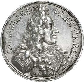 1121. STUART (ORANGE). William III. 1694-1702. AR Medal (47mm, 42.40 g, 12h). The Association of 1696. By G. Sorberger. Dated 1696. GVILH : M . BRIT FR . ET . HIB . REX, armored bust right / FELIX . ASSOCIATIO . A . DOMINO ., Fame flying right, blowing trumpet and holding ribbon inscribed WIL REX ASSOCIATIONIS; globe below, 16 96 in exergue. MI 155/420; Eimer –. Lightly toned, hairlines, edge marks. Near EF. Extremely rare – one of only two examples in CoinArchives. ($1000)