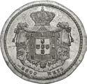 1118. PORTUGAL, Kingdom. Maria II a Educadora (the Educator). 1826/1834-1853. PB/Tin Splasher for a 2500 Réis master die (patrix) (20mm, 1.21 g). London mint. By Jean Baptiste Merlen. Struck 1836. Crowned and mantled coat-of-arms. Small incuse and retrograde 500 below. For pattern, see: KM Pn96; Gomes E16.01. A few minor marks. Mostly as made. Extremely rare. ($500)