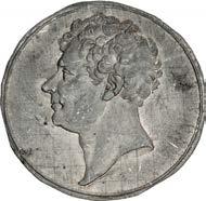 1108. HANOVER. William IV. 1830-1837. PB/Tin Splasher for a Crown die (38mm, 9.95 g). London mint. By Jean Baptiste Merlen. Dated 1837. Coat-of-arms within Garter surmounted by crowned helmet with garland; below, banner reading DIEU ET MON DROIT; ANNO 1837 below; J.B. MERLEN to lower left. For trial strike in Barton’s metal, see: L&S 12 = Bull 2470 = Lingford (Glendining, 24 October 1950), lot 541. No surviving dies match this splasher. Mostly as made. Extremely rare. ($500)