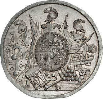 1111. HANOVER. William IV. 1830-1837. PB/Tin Splasher for a Medal die or master die (patrix) (36mm, 4.77 g). Army Long Service and Good Conduct Medal. London mint. By Benedetto Pistrucci (or Jean Baptiste Merlen?). Struck 1830. Coatof-arms set on pile of arms and armor. Mostly as made. Extremely rare. ($500)