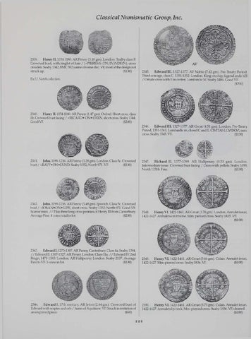 2340. H e n r y Π. 1154-1180. AR Penny (1.47 gm). Oxford. Short cross, class lb. Crowned bust facing / +RICARD · O N · OXEN, short cross. Seaby 1344. Good VF. ($2)ש 2346. E d w a r d III. 1327-1377. AR Groat (4.51 gm). L o n d o n . Pre-Treaty Period, 1351-1361. Lombardic m, closed C a n d E. OVITAS LOWDOI4; m m : cross. Seaby 1565. VF. ($100)