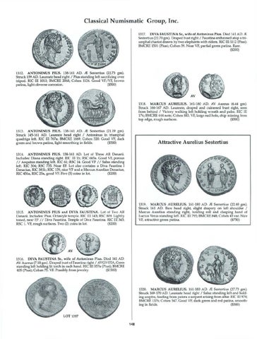 Classical Numismatic Group, Inc. 1317. DIVA FAUSTINA Sr., wife of A n t o n i n u s Pius. Died 141 AD. JE Sestertius (22.70 gm). Draped bust right / Faustina enthroned atop a triumphal chariot d r a w n by two elephants with riders. RIC ΙΠ 1112 (Pius); BMCRE 1501 (Pius); Cohen 59. Near VF, partial green patina. Rare. ($200)