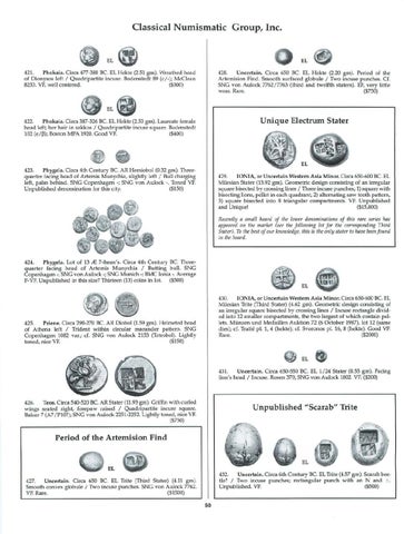 424. Phygela. Lot of 13 JE 7-8mm׳s. Circa 4th Century BC. Threeq u a r t e r facing h e a d of Artemis M u n y c h i a / Butting bull. SNG C o p e n h a g e n -; SNG v o n Aulock -; SNG Munich -; BMC Ionia -. Average F-VF. Unpublished in this size? Thirteen (13) coins in lot. ($300) EL 430. IONIA, or Uncertain Western Asia Minor. Circa 650-600 BC. EL Milesian Trite (Third Stater) (4.62 gm). Geometric design consisting of an irregular square bisected by crossing lines / Incuse rectangle divided into 12 smaller compartments, the two largest of w h i c h contain pellets. M ü n z e n u n d Medaillen Auktion 72 (6 October 1987), lot 12 (same dies); cf. Traité pl. 1, 4 (hekte); cf. Svoronos pl. 16, 8 (hekte). Good VF. Rare. ($2000)