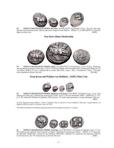 61. THRACO-MACEDONIAN TRIBES, Uncertain. Circa 500-480 BC. AR Drachm or Oktobol (16mm, 3.77 g). Bull kneeling right, head left; floral ornament in exergue / Quadripartite incuse square. Peykov –; HPM pl. II, 23 (same obv. die; Derrones); AMNG III/2, 5 (same obv. die; Orreskioi); SNG ANS –; McClean 3121 (same obv. die; Akanthos); CNG 87, lot 283 (same obv. die). VF, toned, die rust on obverse. Very rare. ($500) 21
