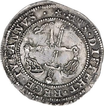 5624892. IRELAND, The Great Rebellion. Issues of the Lords Justices. 1642-1649. AR Shilling (29mm, 5.82 g, 1h). “Ormonde Money” issue. Struck 1643-1644. Large C • R; crown above; all within linear and beaded border / Large X II; D above; all within linear and beaded border. D&F 297; SCBC 6546. Toned, edge split, minor mark. Good VF. Struck on a broad flan. $1450
