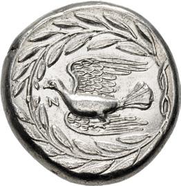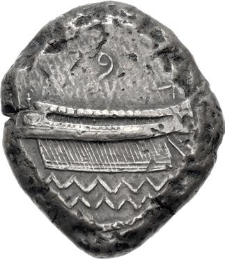 During their travels, Aegina’s merchants were exposed to the newly invented coins used by the Lydians and Ionians and took note of how they made transactions much easier. Although she had no native electrum or gold, Aegina had access to productive silver mines on the nearby island of Siphnos and so began to produce her own coins circa 550 BC. These early silver staters depicted on their obverses a sea turtle (emblematic of their marine interests, and perhaps a visual play on the island’s humped-