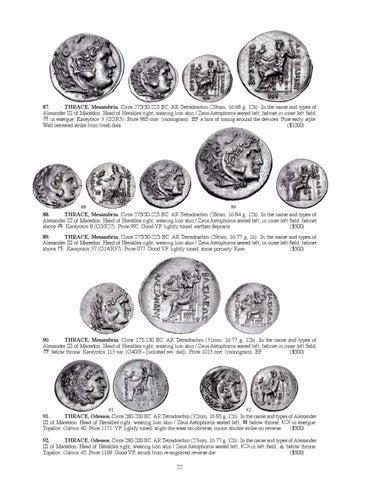 91 92 91. THRACE, Odessos. Circa 280-200 BC. AR Tetradrachm (32mm, 16.85 g, 12h). In the name and types of Alexander III of Macedon. Head of Herakles right, wearing lion skin / Zeus Aëtophoros seated left; D below throne, ˚o5 in exergue. Topalov, Odesos 40; Price 1171. VF, lightly toned, slight die wear on obverse, minor double strike on reverse. ($500) 92. THRACE, Odessos. Circa 280-200 BC. AR Tetradrachm (27mm, 16.77 g, 12h). In the name and types of Alexander III of Macedon. Head of Herakles right, wearing lion skin / Zeus Aëtophoros seated left; ˚o5 in left field, Ú below throne. Topalov, Odesos 45; Price 1169. Good VF, struck from re-engraved reverse die. ($500) 22