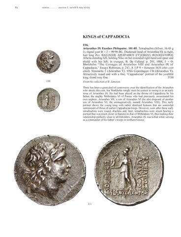 KINGS of CAPPADOCIA 116. Ariarathes IX Eusebes Philopator. 101-85. Tetradrachm (Silver, 16.45 g 1), regnal year Β = 2 = 99/98 BC. Diademed head of Ariarathes IX to right, hair long Rev. ΒΑΣΙΛΕΩΣ ΑΡΙΑΡΑΘΟΥ ΕΥΣΕΒΟΥΣ ΦΙΛΟΠΑΤΟΡΟΣ Athena standing left, holding Nike on her extended right hand and spear and shield with her left; in exergue, Β. De Callataÿ p. 201, 1968, 5 = O. Mørkholm “The Coinages of Ariarathes VIII and Ariarathes IX of Cappadocia,” Essays Robinson, p. 247, A 1-P 9 = Jameson 1634 (this coin cited). Simonetta 5 (Ariarathes V). SNG Copenhagen 136 (Ariarathes V). Attractively toned and with a fine, ‘Cappadocian’ portrait of the youthful king. Good very fine. 3750 116