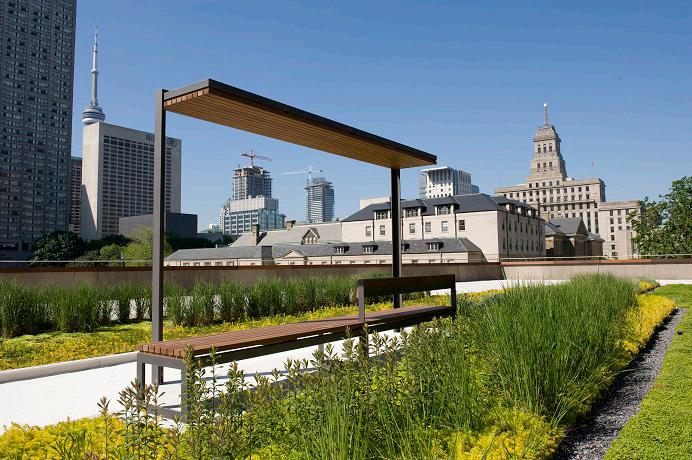A new trend is the combining of green roofs with solar panels because it yields a number of advantages. For example, by incorporating solar panels racking within the green roof system, additional weight from vegetation and growing medium acts as ballast, thereby improving stability and eliminating the need for roof penetrations. Furthermore, the green roof’s evapotranspiration generates cooler air which helps to increase panel energy production by anywhere from 5 to 15 per cent. This is because when solar panels get hot they lose production efficiency. Other benefits include extending the waterproofing lifespan so the panels don’t have to be removed to re-waterproof; improved building energy efficiency, and even increased biodiversity, the result of creating microclimates.