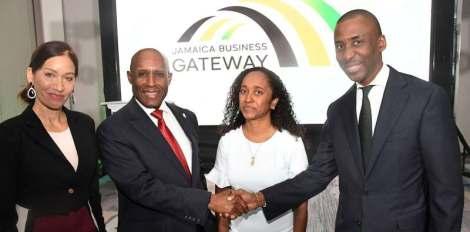 Official witnesses standing le to right: Senator the Honorable Aubyn Hill, Jamaica’s Minister of Industry, Investment and Commerce; Ms. Calibe Thompson, President of Island Space, and R. Oliver Mair, Jamaica’s Consul General. – Contributed