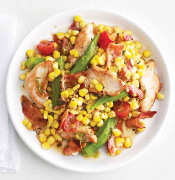 3. Heat the remaining 1/2 tablespoon olive oil in the pan, then add the okra and a pinch of salt and cook, stirring, 3 minutes. Add the chicken broth, 1/2 cup water, the corn and tomatoes and bring to a simmer; cook, stirring occasionally, until the okra is tender and the tomatoes begin to fall apart, 3 to 5 minutes. Return the turkey and bacon to the pan and simmer until the turkey is just cooked through, about 1 more minute. Stir in the lemon juice and season with salt and pepper.