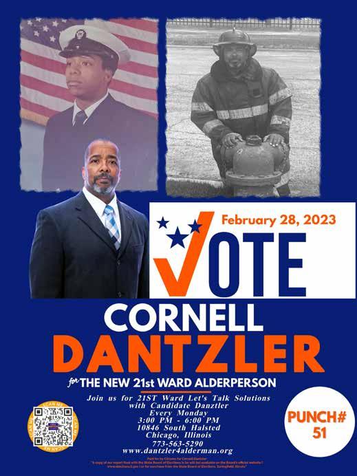 Dr. Odewale’s work sheds light on the impact of racism and racial violence in America through the lens of a community that continues to survive. “Greenwood: A Century of Resilience comes to the Auditorium Theatre located at 50 E. Ida B. Wells Drive Sunday, Jan. 29, 2023, at 2 p.m. Tickets are priced between $5-$48 and are available at www. auditoriumtheatre.org.