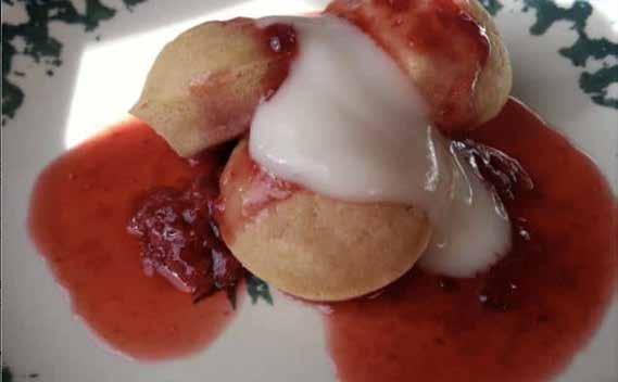 6. While the pancakes are baking, prepare the berry sauce. Place frozen strawberries and grape jelly into a microwave-safe bowl and heat until warm. Mash berries with a fork and mix well.