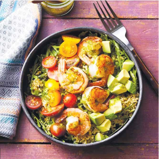 • Step 3 Add arugula and quinoa to the large bowl with the vinaigrette and toss to coat. Divide the arugula mixture between 4 bowls. Top with tomatoes, avocado and shrimp. Drizzle each bowl with 1 tablespoon of the reserved pesto mixture.